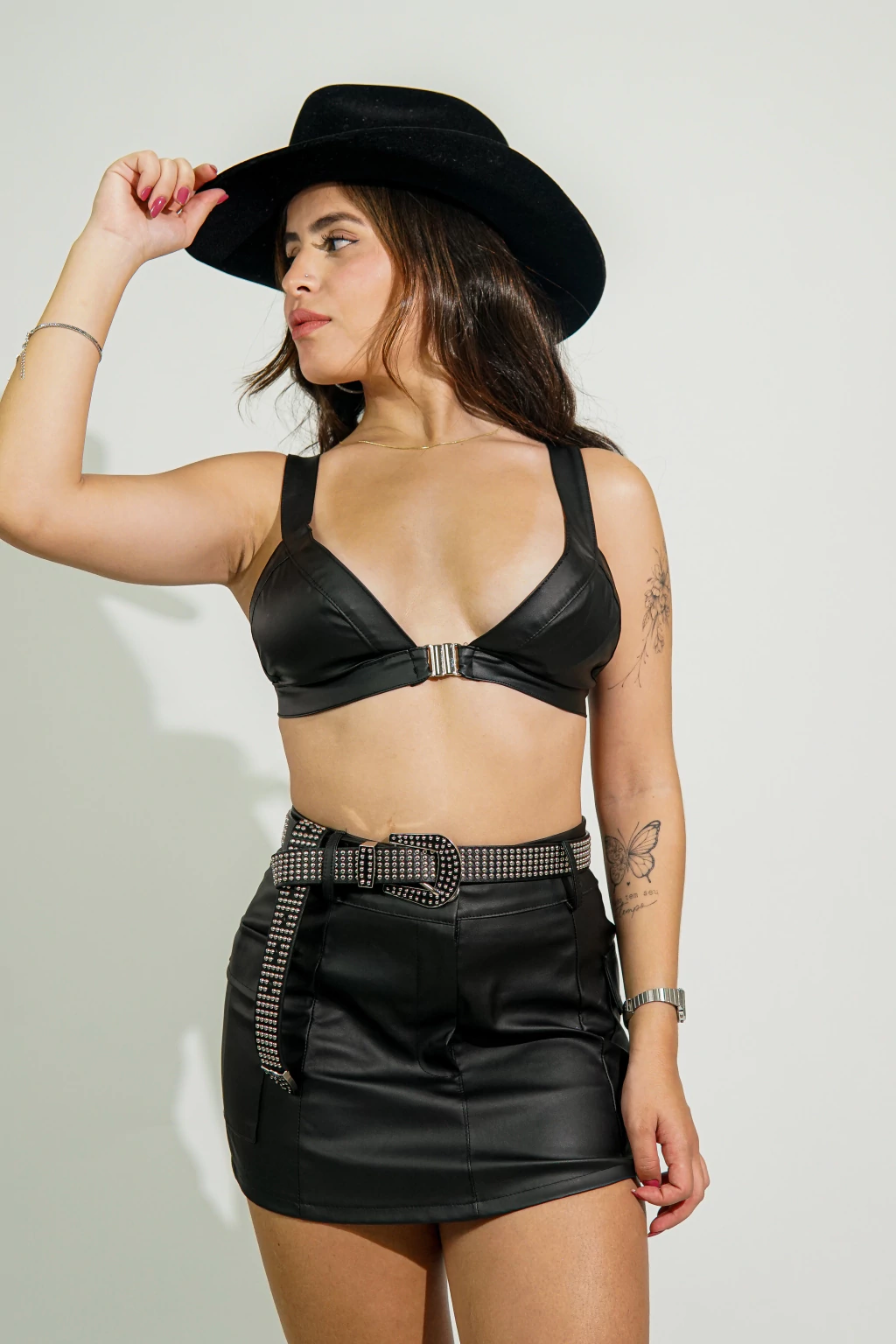 • O Cropped Shakira é aquele mini cropped cheio de atitude que transforma qualquer look 😍 Feito em tecido corino, ele tem costas semi nua, fecho prata na frente e um caimento colado que valoriza o corpo na medida certa. Perfeito pra usar com sobreposições ou sozinho em produções bem fashionistas — é puro poder!