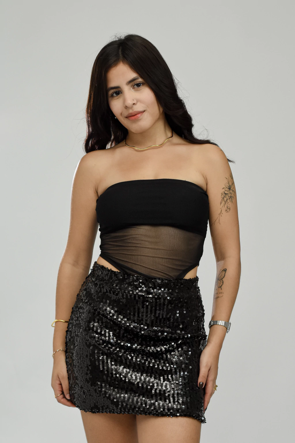 A saia é forrada internamente, o que garante que os paetês não pinquem, oferecendo total conforto enquanto você brilha com estilo.